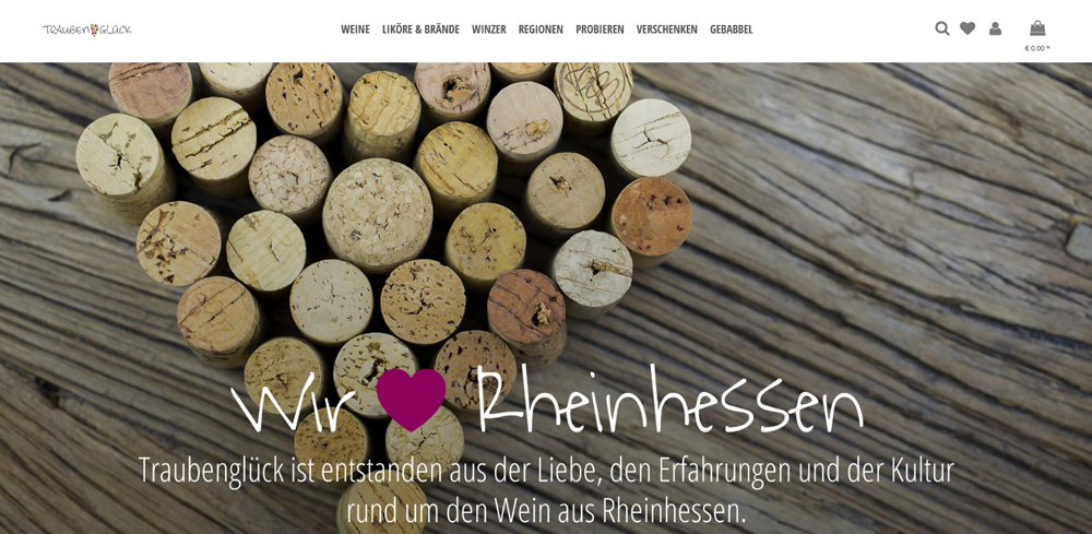 Auf der Webseite von Traubenglück kann man Wein, Sekt, Liköre, Brände und Traubensaft aus Rheinhessen bestellen. Ebenso im Angebot sind diverse Probierpakete für jeden Weingeschmack. Interessant und schön anzuschauen ist auch der seiteneigene Blog „Gebabbel“ mit zahlreichen Themen aus den Bereichen Wein und Rheinhessen.