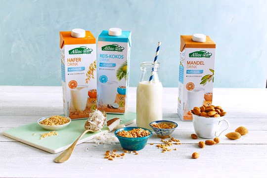 Von Allos gibt es als Milchalternative jetzt sechs neue Sorten pflanzlich basierter Drinks in Bio-QualitätHafer, Reis, Reis-Kokos, Mandel, Soja und Dinkel Drink.