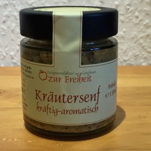 Hier kommt uns ein großes Aromenspektrum entgegen: Curry, Liebstöckel und Lauch. Konsistenz: Eine bunte Mischung verschiedener Senfkörner.. Das Kräuterroma passt prima zu kräftigen Grill-Würstchen Diese Variante wurde vom Testerteam sehr positiv bewertet.